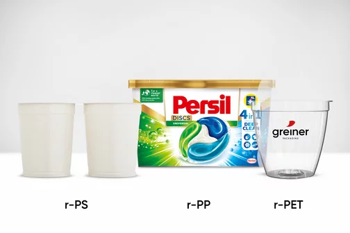 Product examples of Greiner Packaging's recycled materials range.With Henkel, our long-standing partnership resulted in toilet-rim cages made from 30% post-consumer recycled material and 70% renewable feedstock PP, combining functionality and aesthetics with an improved environmental footprint.